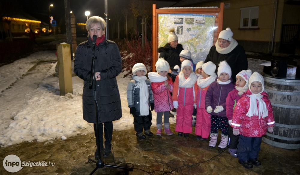 Dr. Tóásóné Gáspár Emma polgármesterasszony hivatalos megnyitója után a község adventi koszorúja mellett az idei évi első köszöntőbeszédet Polreisz Györgyi Éva óvodavezető mondta el, aki több idézettel is utalt a szeretet ünnepének fontosságára.