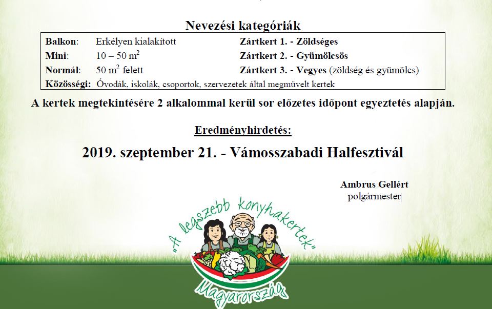 Kovács Szilvia ötletgazda, Karcag város alpolgármestere által létrehozott „A legszebb konyhakertek” – Magyarország legszebb konyhakertjei országos programhoz csatlakozva Vámosszabadi Község Önkormányzata ez évben is meghirdeti „A legszebb konyhakertek”programot!