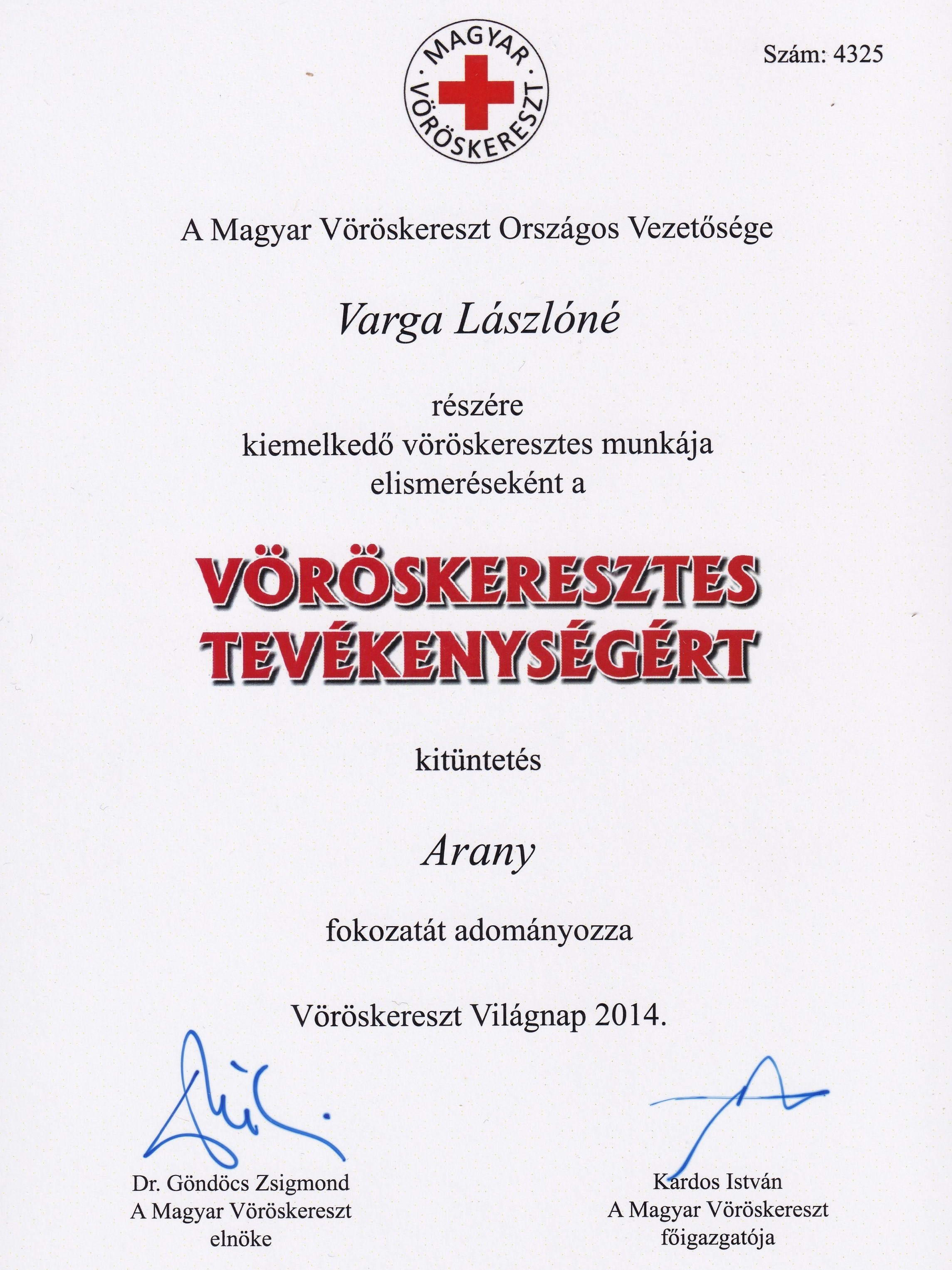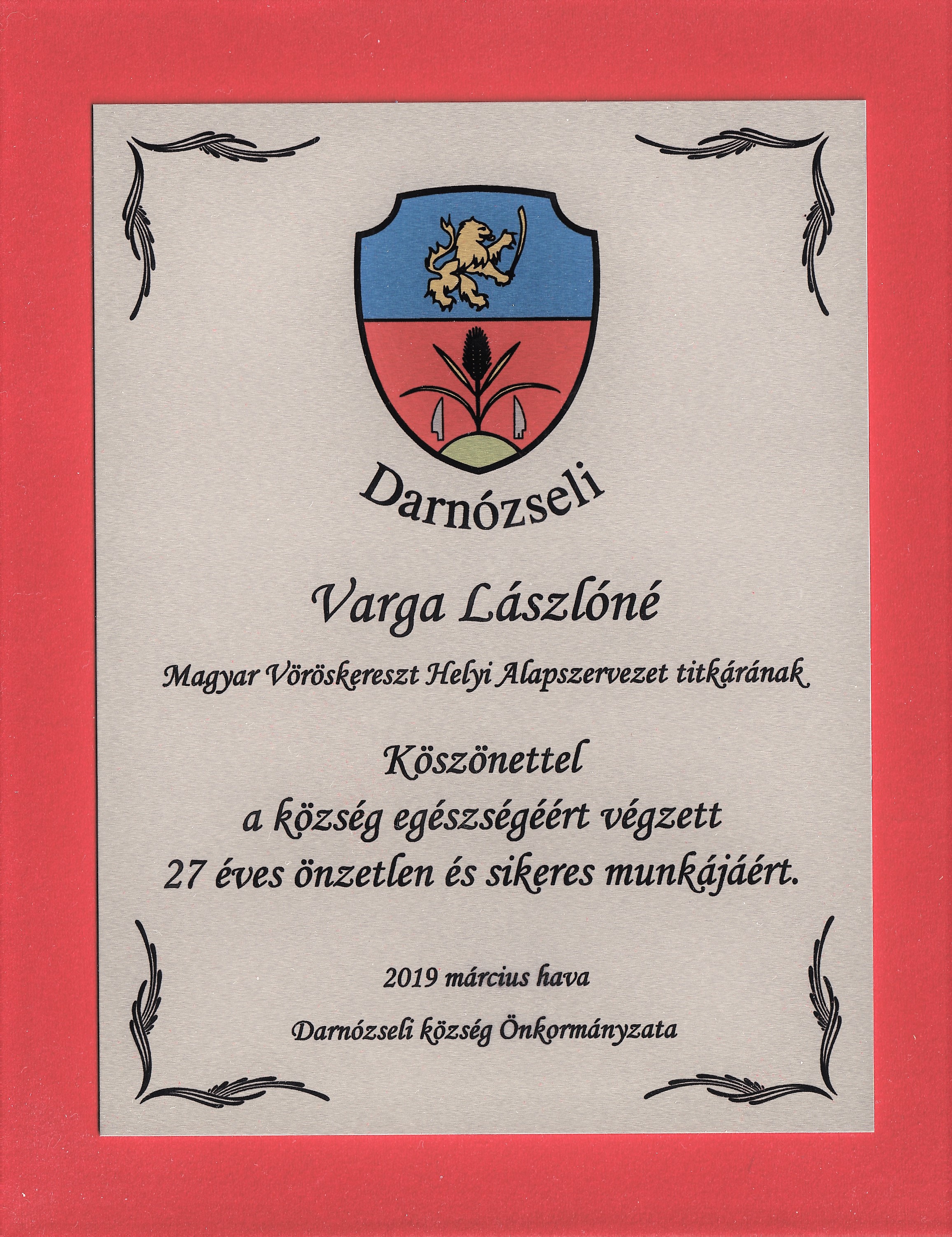 A Vöröskereszt mellett a Darnózseli község is a hosszú évek során végzett munkáját számos alkalommal elismerte, jutalmazta. Varga Lászlóné nyugdíjba vonulása után sem hagyta abba a karitatív munkában való részvételét, a titkári teendőket egy fiatal aktivistának átadva, ma is ugyanolyan elánnal veszi ki részét a közösségi munkából, mint tette évtizedeken keresztül.