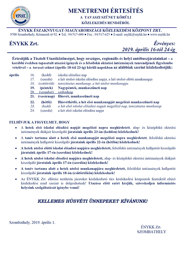 Az Északnyugat-magyarországi Közlekedési Központ Zrt. értesíti a Tisztelt Utazóközönséget, hogy országos, regionális és helyi autóbuszjáratait – a korábbi években tapasztalt utazási igények és a felsőfokú oktatási intézmények tanrendjének figyelembe vételével – a tavaszi szünet (április 18-tól 23-ig) körüli napokban az alábbiak szerint közlekedteti: