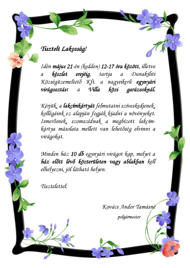 Május 21-én a Dunakiliti Községüzemeltető Kft. egynyári virágosztást tart a Villa közi garázsoknál. Részletek a plakáton.