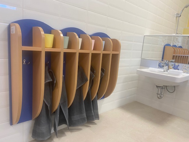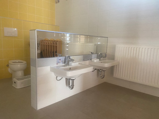 A folyosón színes szekrények, jelekkel megkülönböztetve, a mellette lévő helyiségben pedig aprócska wc-k, csapok, fogmosópoharak találhatók, de fürdőkád és pelenkázó is könnyíti majd a dolgozók munkáját.