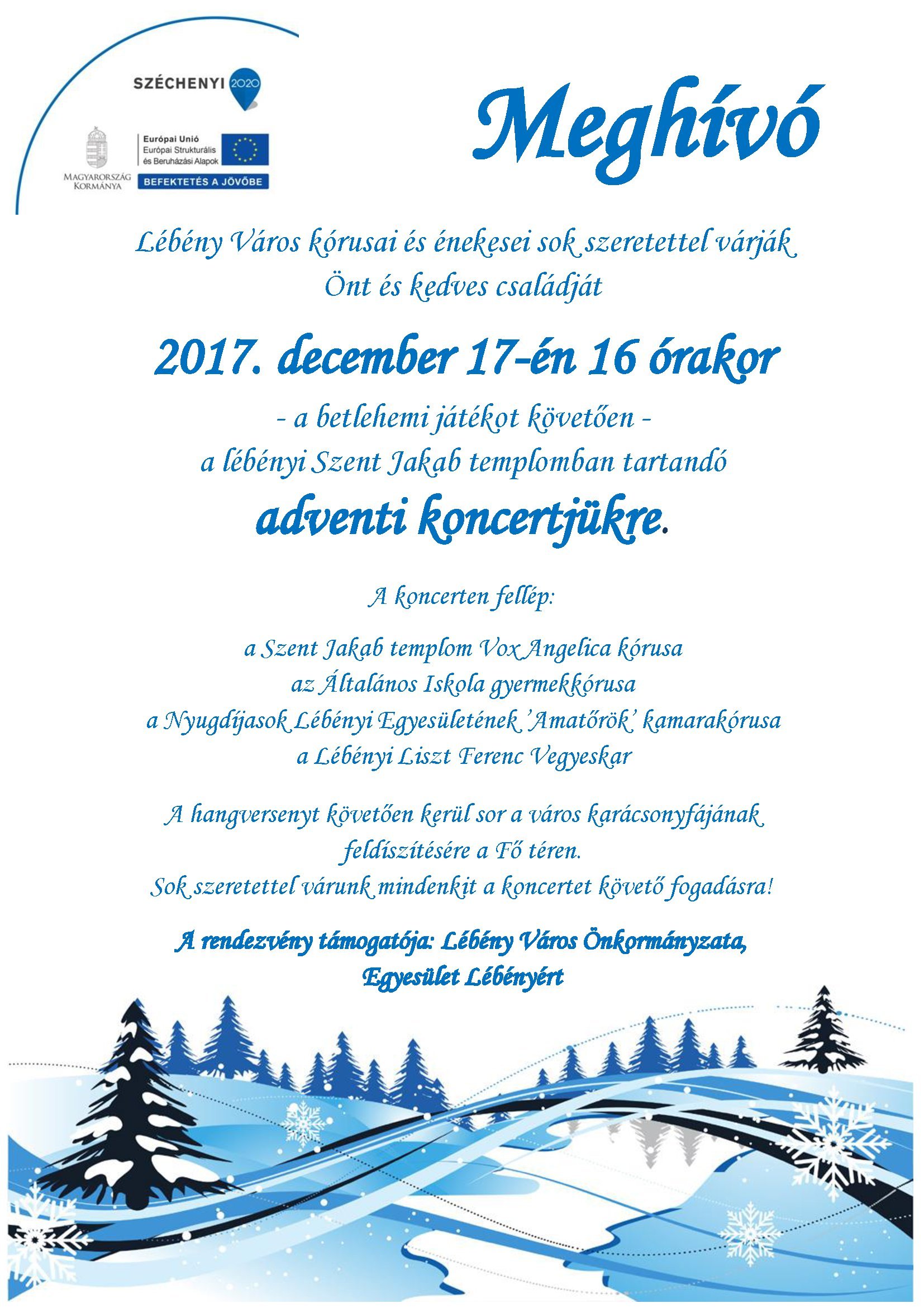 Lébény Város kórusai és énekesei sok szeretettel várják Önt és kedves családját december 17-én 16 órakor a lébényi Szent Jakab templomban tartandó adventi koncertjükre.