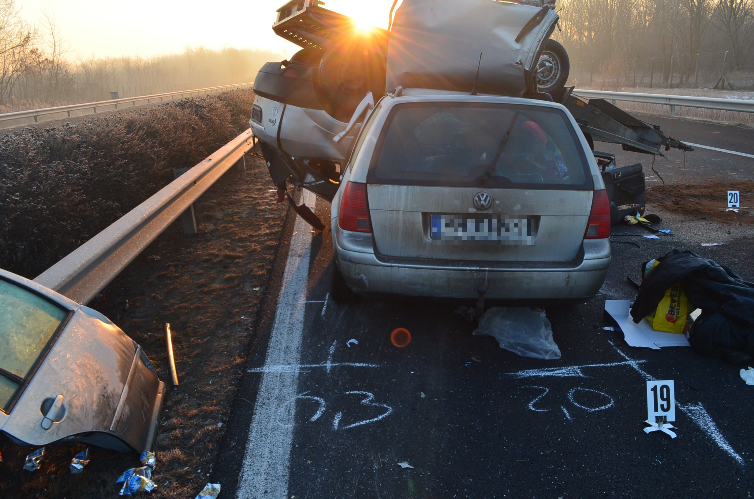 Ezt követően érkezett oda egy – Hegyeshalom felől Győr irányába közlekedő - Volkswagen típusú személygépkocsi szintén román állampolgárságú vezetője, aki a pályatesten keresztben feje tetején álló pótkocsinak és az azon rögzített állapotban lévő Ford Focus típusú személygépkocsinak ütközött.