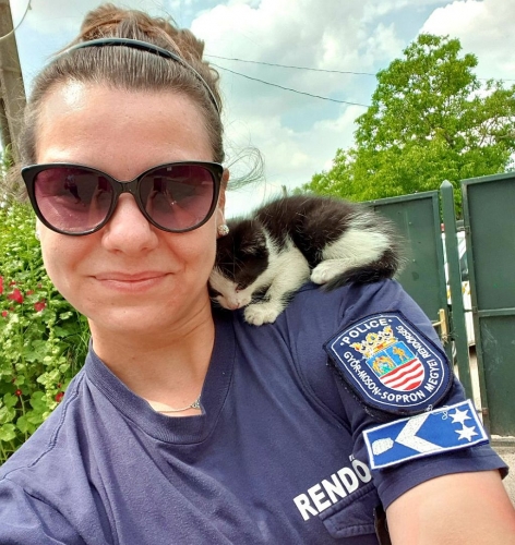 A rendőrök egy ott parkoló személyautó motorteréből érkező nyávogásra figyeltek fel. A megyei ügyeletesen keresztül felvették a kapcsolatot az autó tulajdonosával. A gépkocsi motorháztetőjének felnyitása után a járőrök kiszabadították a kiscicát a tűzforró motortérből, megitatták és a Győri Állatmenhelyre vitték, ahol átadták őt a gondozóknak.