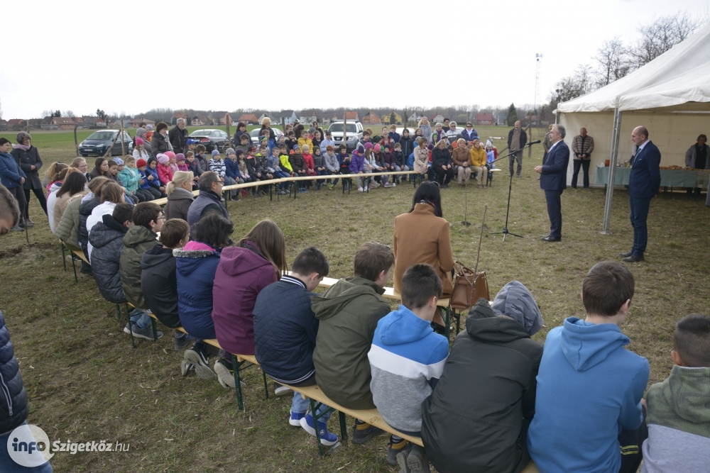 Cseh Benjamin, Dunasziget polgármestere köszöntő beszédében kiemelte, hogy aKOSZISZ Timaffy Endre Általános Iskolában - melya tanévben elnyerte az ÖKO iskola címet is - külön figyelmet fordítanak a tisztelet, a szeretet, az egymás megbecsülésével és összefogással kialakított értékek megtapasztalására, elsajátítására is. Ennek egyik példája a Nefelejcs Gyümölcsöskert létrehozása is, amely két helyi lakos - 50 gyümölcsfa - felajánlásából indult. Ehhez járult hozzá még az Önkormányzat további 30 őshonos gyümölcsfa telepítésével, Kovács Gyula gyümölcsész szakértelmével, valamint egy kiváló közösség szervezésével.