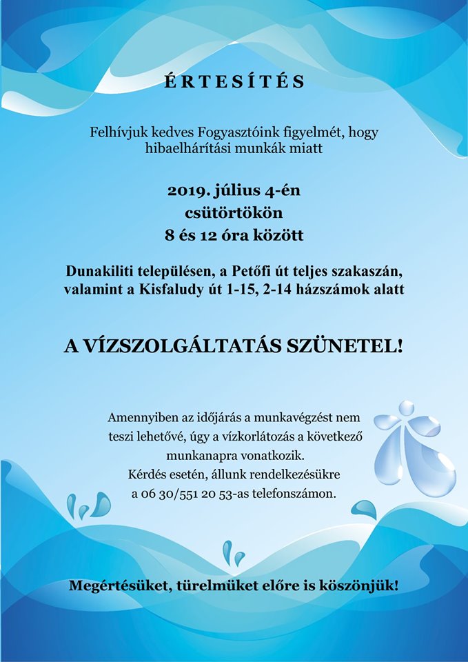 Az Aqua Kft tájékoztatója vízszolgáltatás szüneteltetéséről
