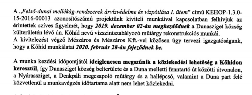 A Dunasziget község külterületén lévő ún. Kőhídon átmenetileg szünetel a közlekedés.