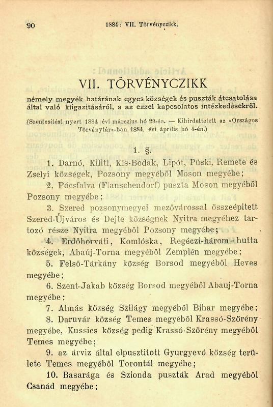 135 éve, 1884. március 29-én nyert szentesítést az 1884. évi VII. törvény, amely „némely megyék határának egyes községek és puszták átcsatolásáról rendelkezett”.