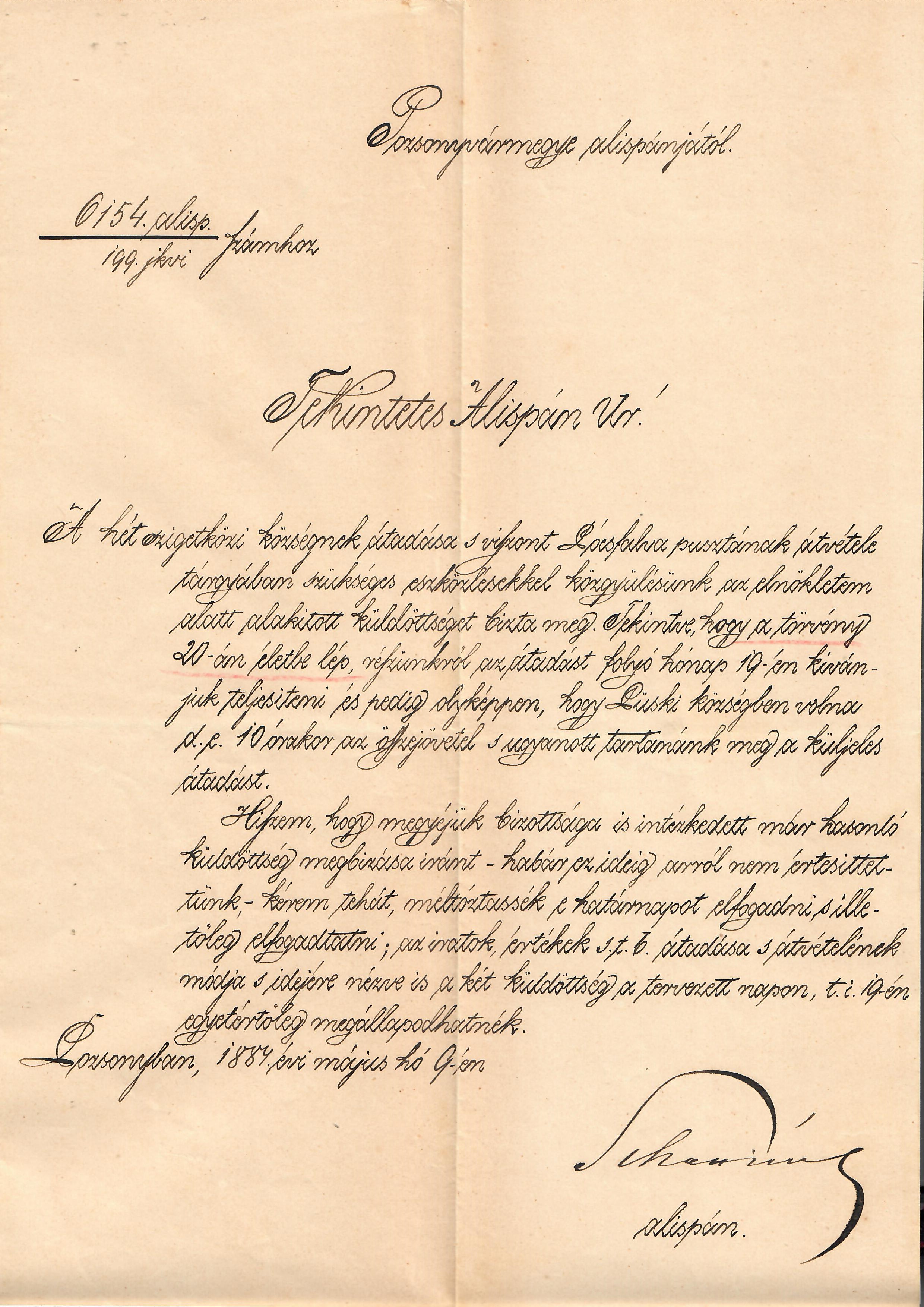 Moson megye küldöttsége a következő tagokból állt: Pataky Fábián alispán küldöttségi elnök, dr. Cselley János törvényhatósági bizottsági tag (közjegyző), Nedeczky János törvényhatósági bizottsági tag, Tóth Imre megye főjegyző, Hardy Lajos törvényhatósági tiszti ügyész, Ékei Antal levéltáros, Koós Sándor magyaróvári és Fröchlich Tófor rajkai szolgabírók, Major Pál királyi tanácsos árvaszéki elnök és Modrovich Ernő árvaszéki számtiszt. A küldöttségek úgy állapodtak meg, hogy az iratok átadás-átvétele tekintetében július 1-én és 2-án, Pozsonyban folytatják a főként a közigazgatási, gyámügyi és a levéltári iratok átadás-átvételét. A delegáció Magyaróvárról már korán reggel elindult, hogy a rajkai megálló után, 9 órára megérkezzenek a pozsonyi megyeházára. Itt dr. Cselley, Nedeczky, Pataky, Ékei, Major, Modrovich, Koós és Hardy urak vettek részt. Tóth főjegyző pedig már egy nappal korábban Pozsonyba ment.
