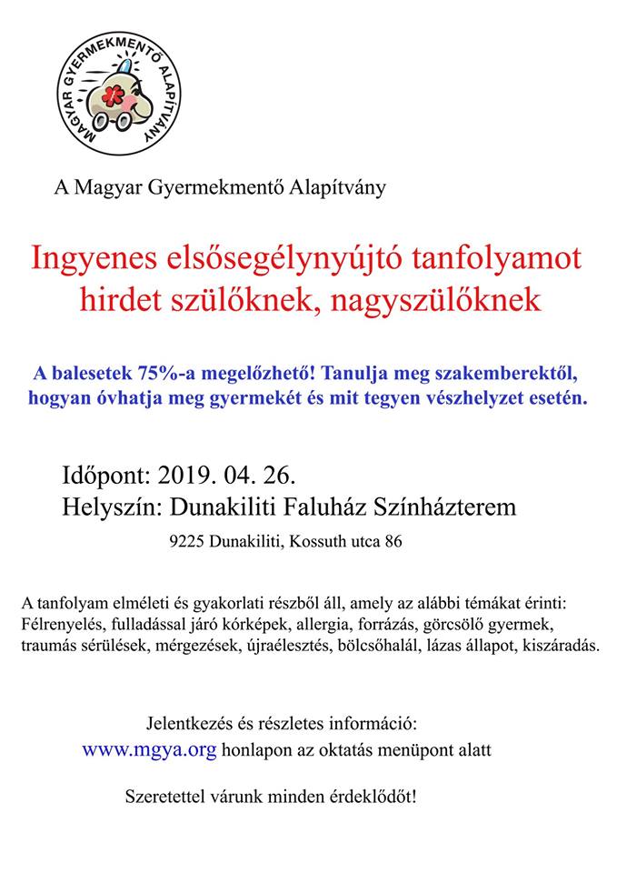 A Magyar Gyermekmentő Szolgálat szervezésében indul a szülők és nagyszülők részére az Elsősegélynyújtó tanfolyam Dunakilitin.
