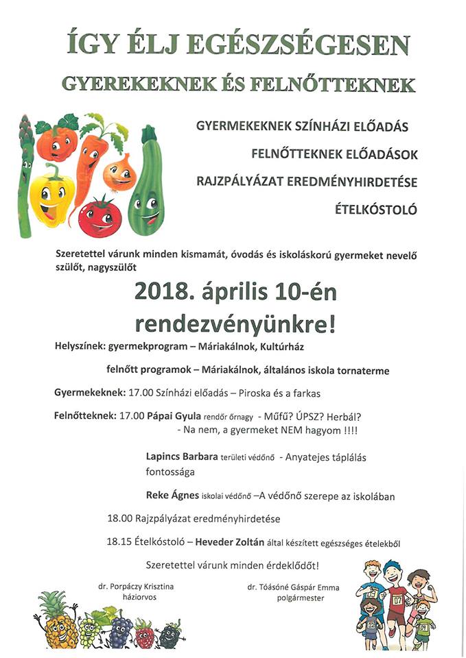 2018. április 10-én minden érdeklődőt szeretettel vár Máriakálnok Önkormányzata az egészség témakörében szervezett rendezvényére!