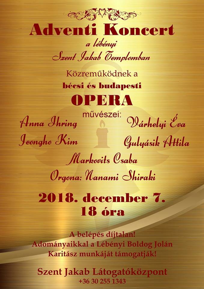 A koncertre 2018 december hetedikén, este 18:00 órai kezdettel kerül sor a lébényi Szent Jakab templomban. A belépés díjtalan. Minden érdeklődőt szeretettel várnak.