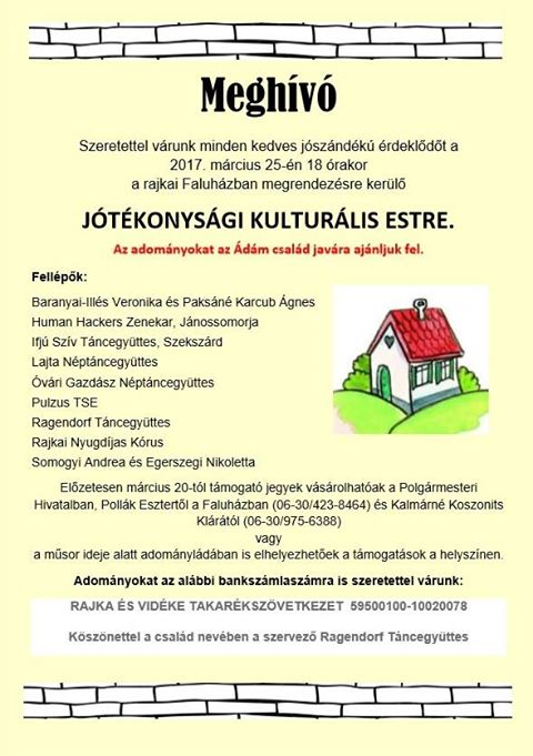 Szeretettel várnak minden kedves jószándékú érdeklődőt a 2017. március 25-én 18.00 órakor a rajkai Faluházban megrendezésre kerülő Jótékonysági Kulturális Estre.
