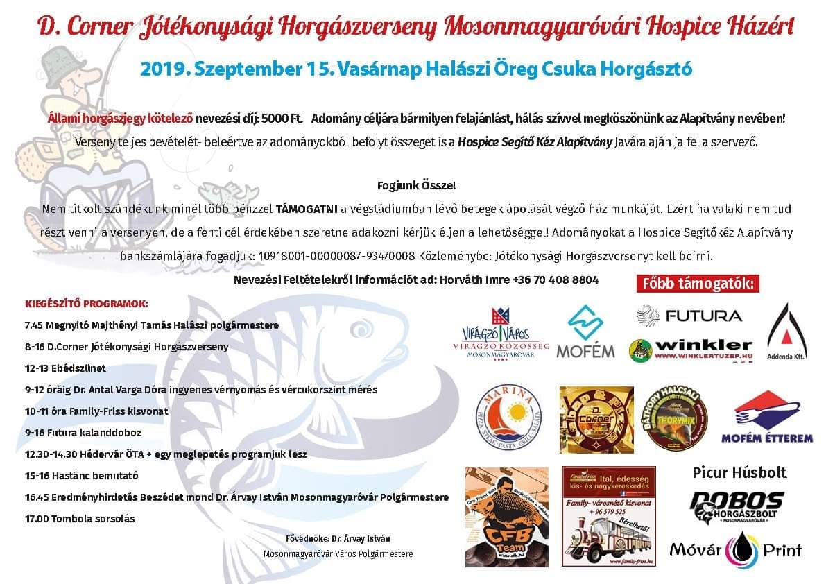 "Szeretnék köszönetet mondani mindazoknak akik idáig pénzbeli vagy tárgyi adománnyal hozzájárultak a D.Corner Jótékonysági Horgászverseny sikeréhez amely a Hospic Ház javára zajlik majd Szeptember 15-én Halászin az Öreg Csuka horgásztón. "- írja a rendezvény szervezője Horváth Imre.
