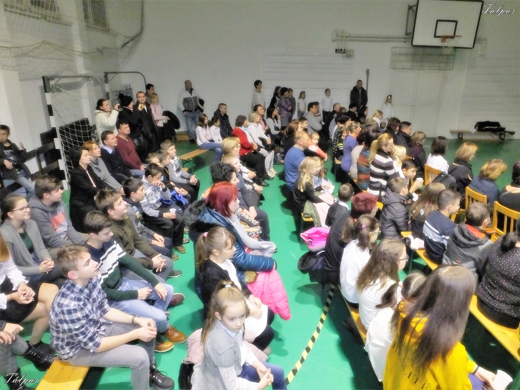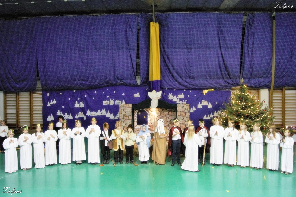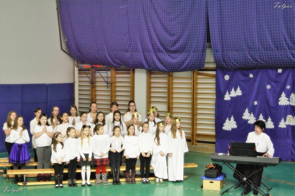 A zsúfolásig megtelt csarnokban került sor a karácsonyi műsorra, melyet az iskola 3. osztályos tanulói adtak elő Nagyné Hartai Marianna tanítónő irányításával.