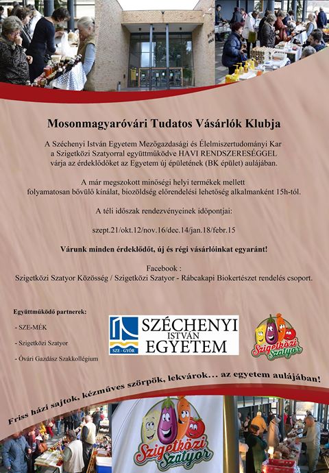 Mosonmagyaróvári Tudatos Vásárlók Klubja néven havonta egyszer rendezik meg csütörtöki találkozóikat a Széchenyi István Egyetemmel karöltve.