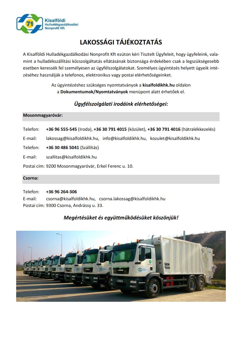 A Kisalföldi Hulladékgazdálkodási Nonprofit Kft. közleménye.