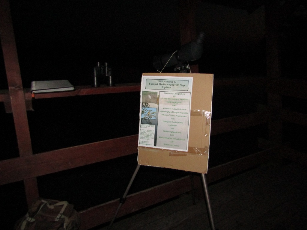 Koromsötétben körvonalazódott a madárvárta jól ismert képe, mely lépes mézként húzott magához. Fel a lépcsőkhöz a platóra, honnan megkezdődhet a Madármegfigyelő Nap.