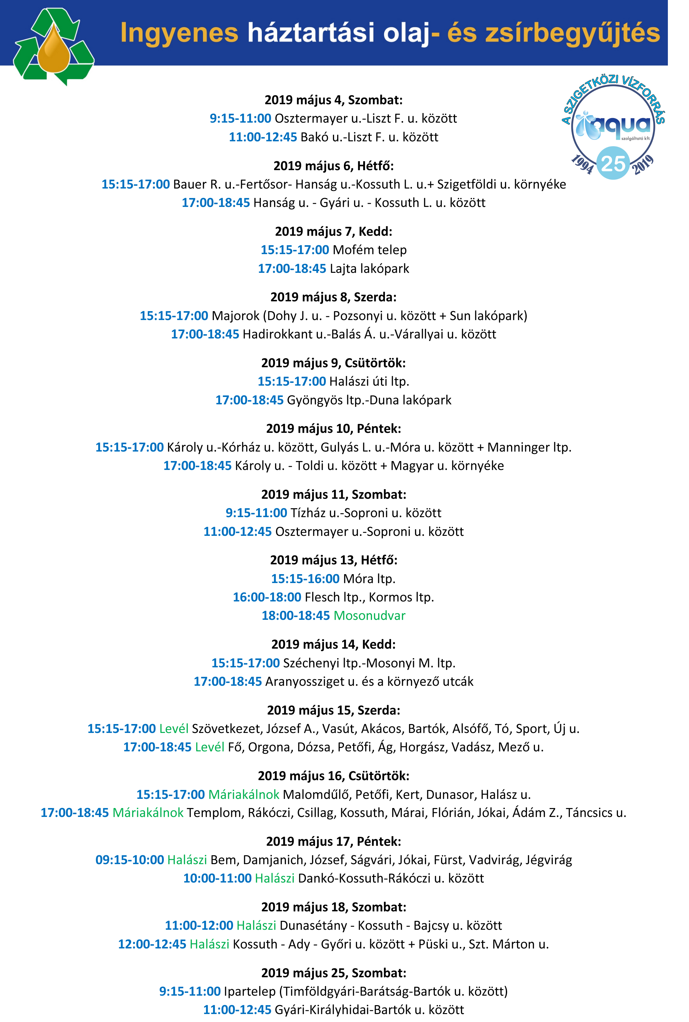 Az AQUA Szolgáltató Kft. május hónapban az alábbi időpontokban gyűjti be a háztartási olajat és zsírt:
