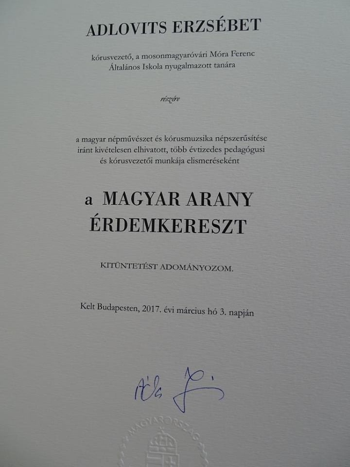 Adlovits Erzsébet kórusvezetőnek, a mosonmagyaróvári Móra Ferenc Általános Iskola nyugalmazott tanárának,