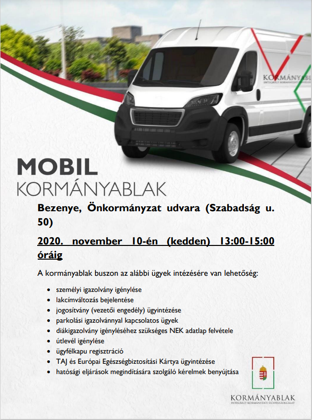 Első alkalommal lesz elérhetők a Mobil Kormányablak szolgáltatásai november 10-én, kedden 13 és 15 óra között Bezenyén.