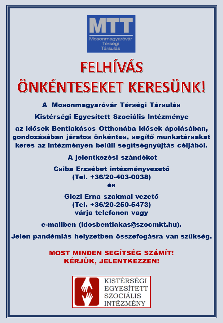 Önkénteseket keres a Mosonmagyaróvári Térségi Társulás Kistérségi Egyesített Szociális Intézménye.
