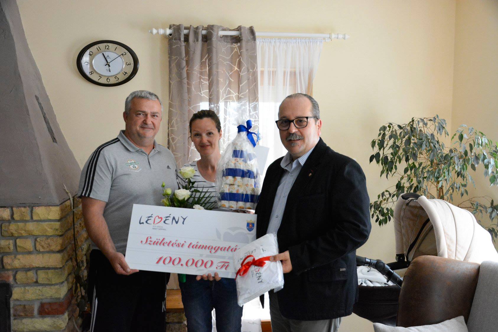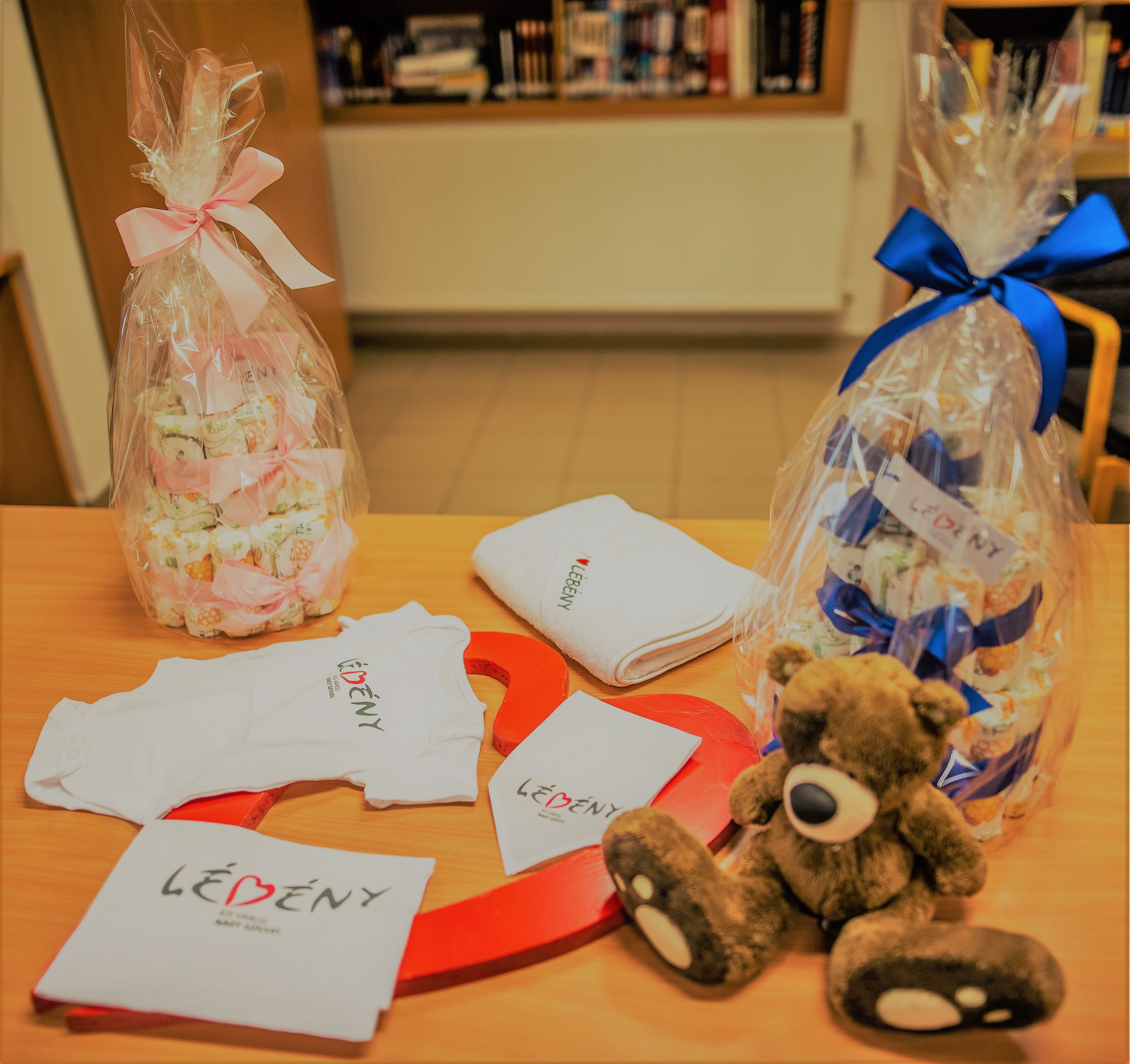Az általunk vitt ajándékkosárban található pelenkatorta, törölköző, body, zsák és egy nyálfogó kendő. Sokat dolgozunk városunk hírnevének erősítésén. Ennek megfelelően talán nem meglepő, hogy ezek a kis ruhadarabok is lébényi logóval ellátottak, hiszen a lébényi életérzés mindenkinek jár.