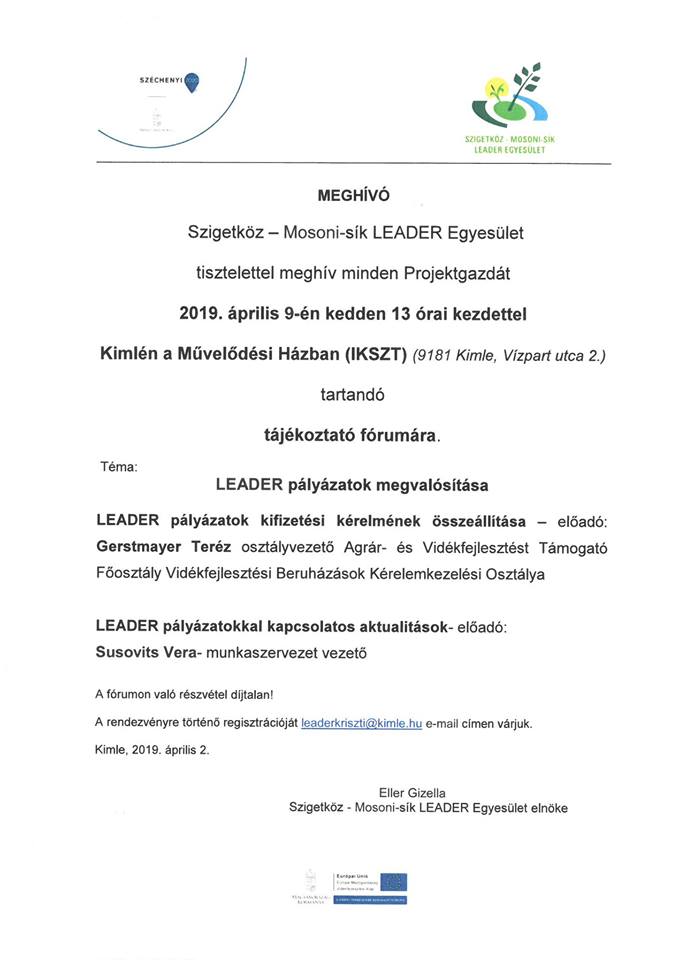 2019. április 9.-én kedden 13 órai kezdettel a Szigetköz – Mosoni-sík LEADER Egyesület fórumot tart Kimlén.