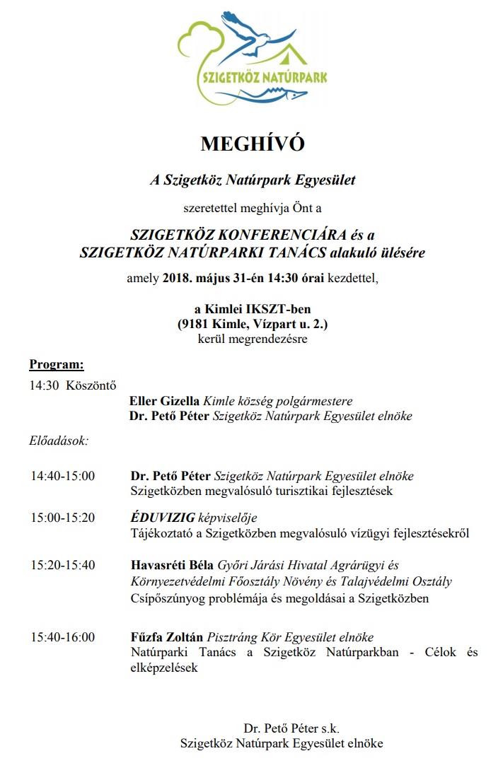 SZIGETKÖZ KONFERENCIÁRA és SZIGETKÖZ NATÚRPARKI TANÁCS alakuló ülésre hív minden kedves érdeklődőt a Szigetköz Natúrpark Egyesület.