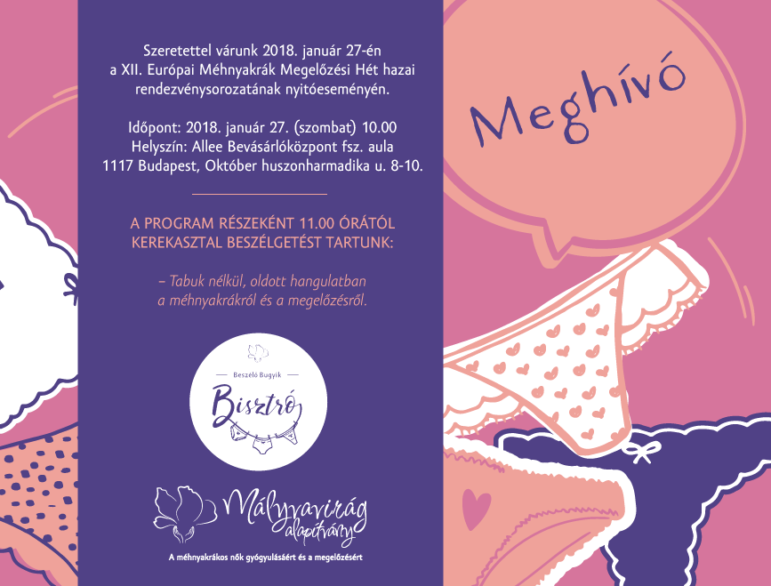 Így már talán nem is olyan megbotránkoztató, hogy a XII. Európai Méhnyakrák Megelőzési Hét országos rendezvénysorozatának budapesti helyszíne a Beszélő Bugyik Bisztró, az ALLEE Bevásárló Központban.