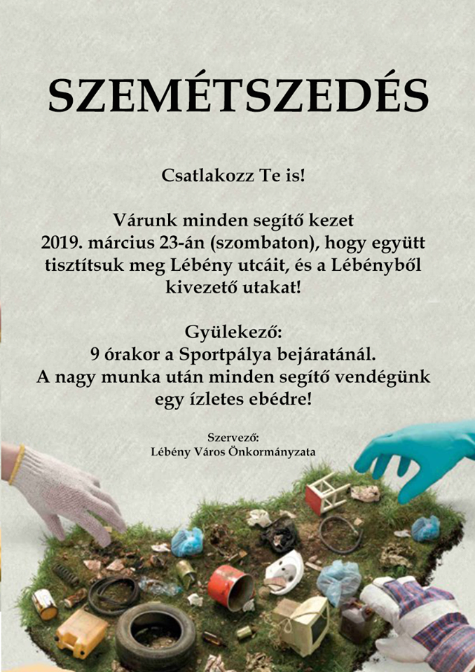 2019. március 23-án (szombaton), hogy együtt tisztítsuk meg Lébény utcáit, és a Lébényből kivezető utakat!